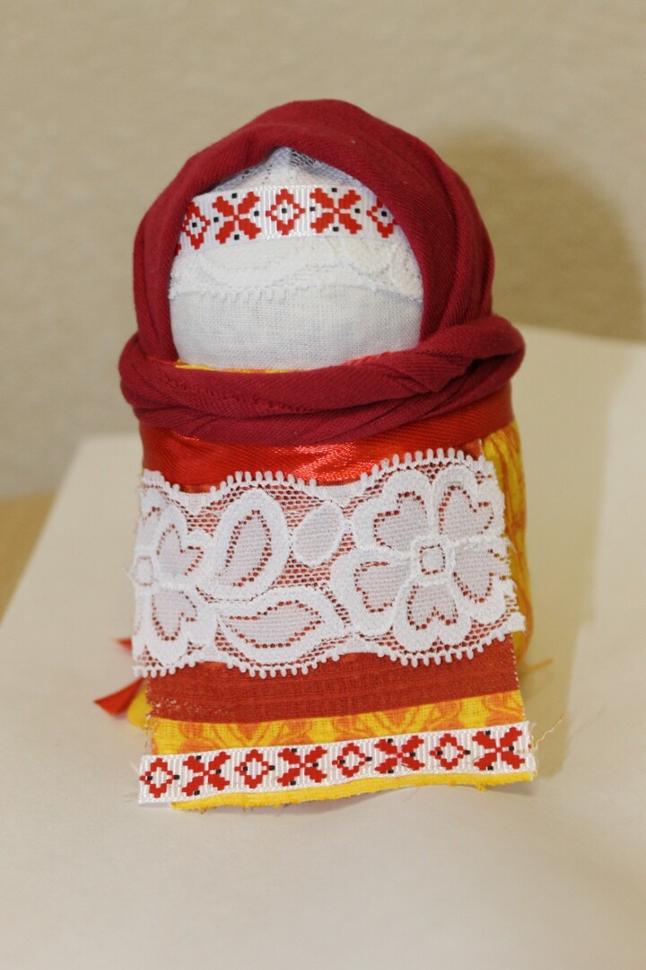 - Чему научится: наполнять куклу зёрнами, правильно перевязывать ткань, создавать традиционный наряд с поясом и платком, украшать ленточками и кружевом.